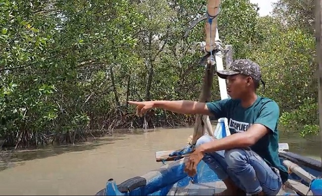 A boat taxi driver points to the place where his former home once stood, now underwater. This was once Rejosari Senik village. It sank before Gemulak village suffered the same fate / Eka Handriana
